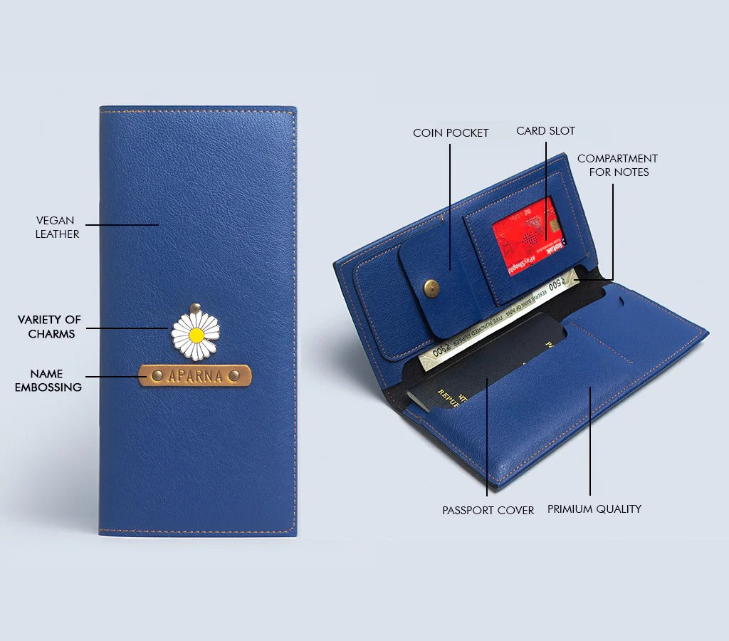 Intelligently Compartmentalized The Travel Wallet is thoughtfully compartmentalized to store all your important documents and currency in a handy and easily accessible format with inside pockets for 1 passport, airline ticket/boarding pass, cards, cash & coins.
