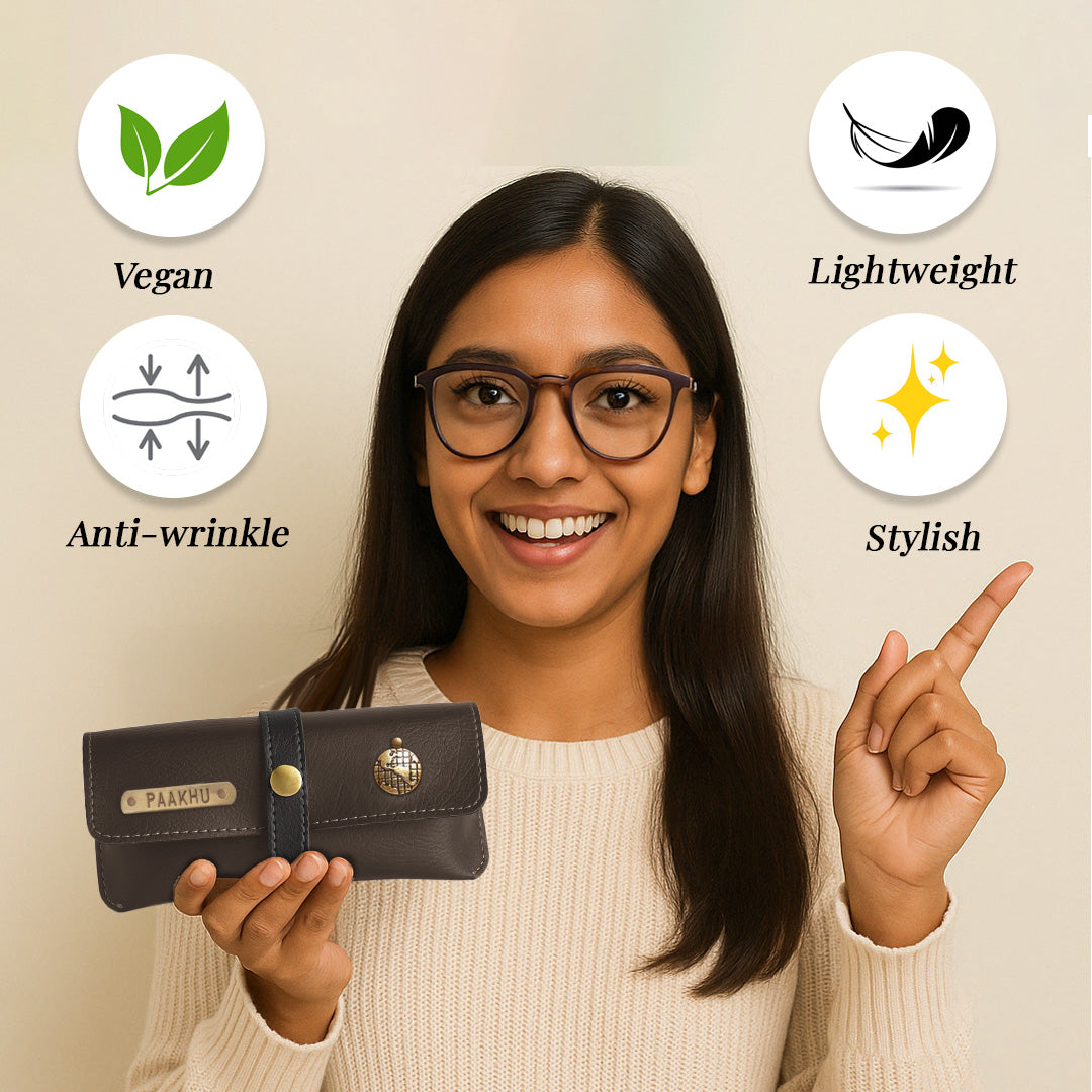 Keep your eyewear safe in style with our sleek black Eyewear Case — crafted from premium vegan leather and finished with contrast stitching and a bold snap-button strap. Whether you're road-tripping with your sunnies or carrying readers to work, this case keeps your lenses protected from scratches and smudges